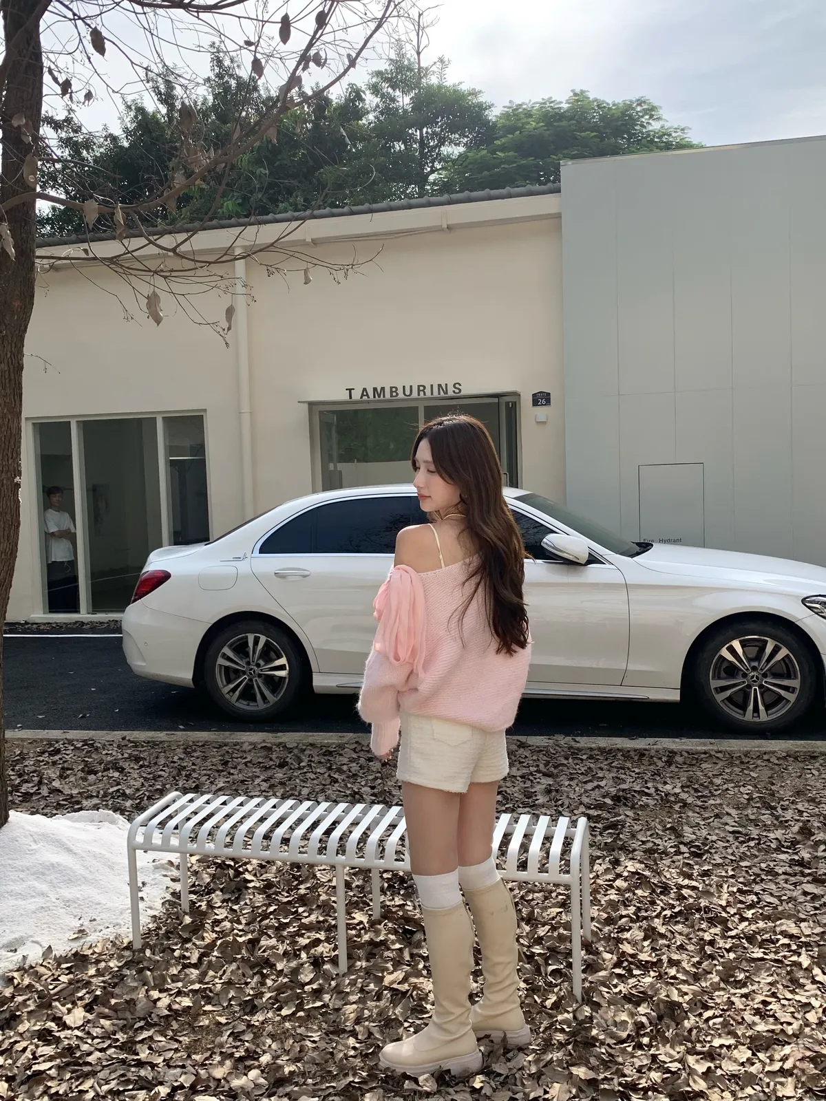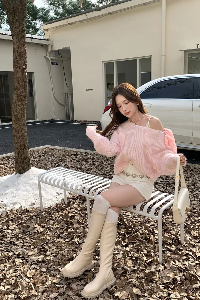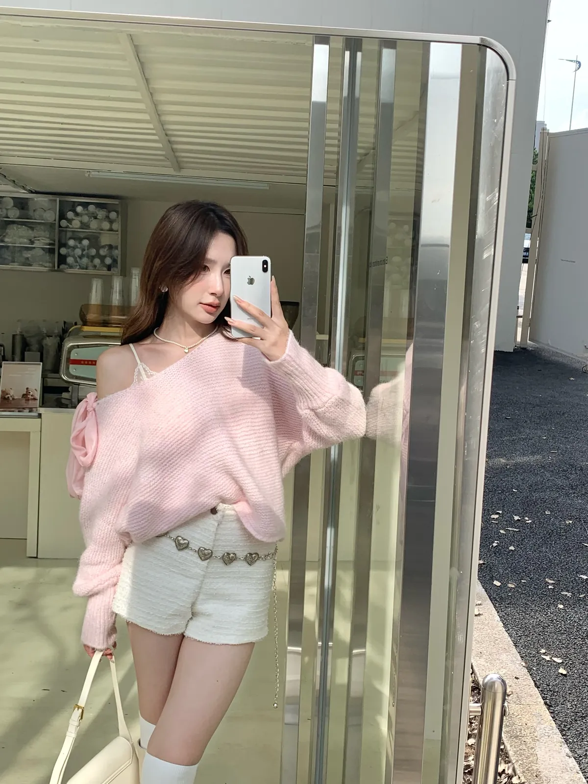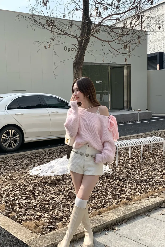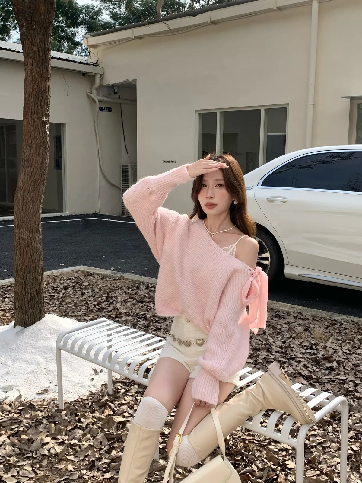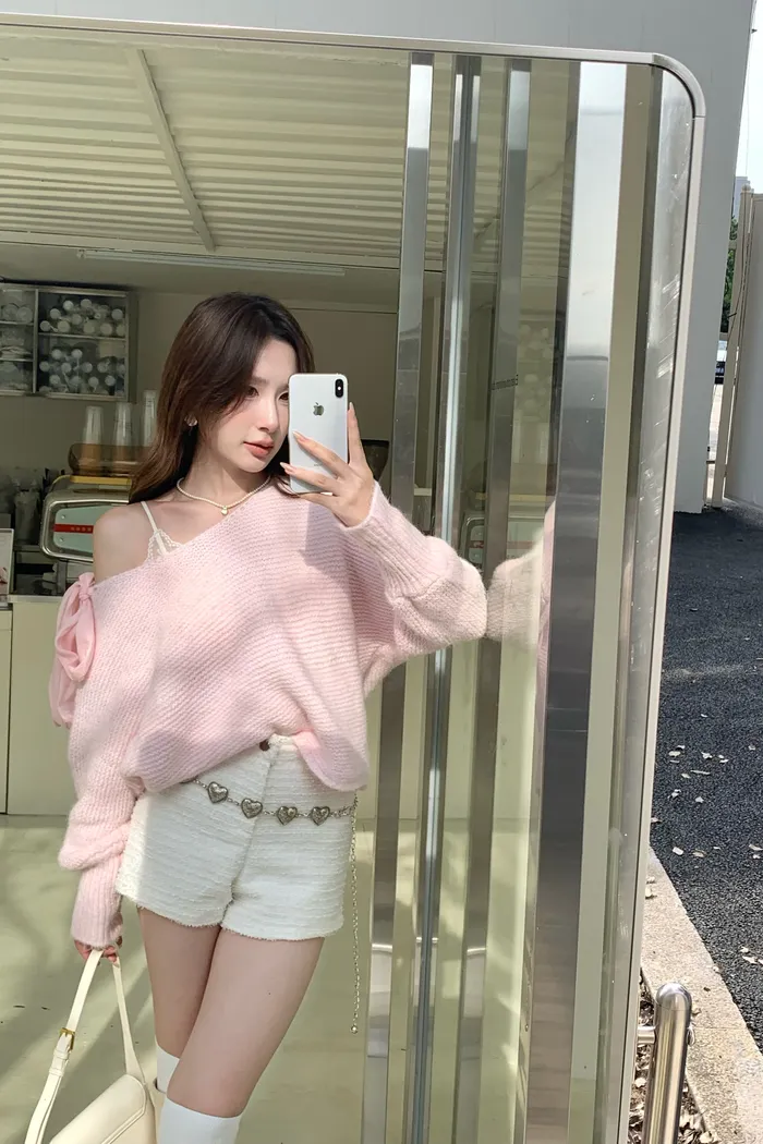 15644 粉嫩色調浪漫 肩綁帶軟糯毛衣