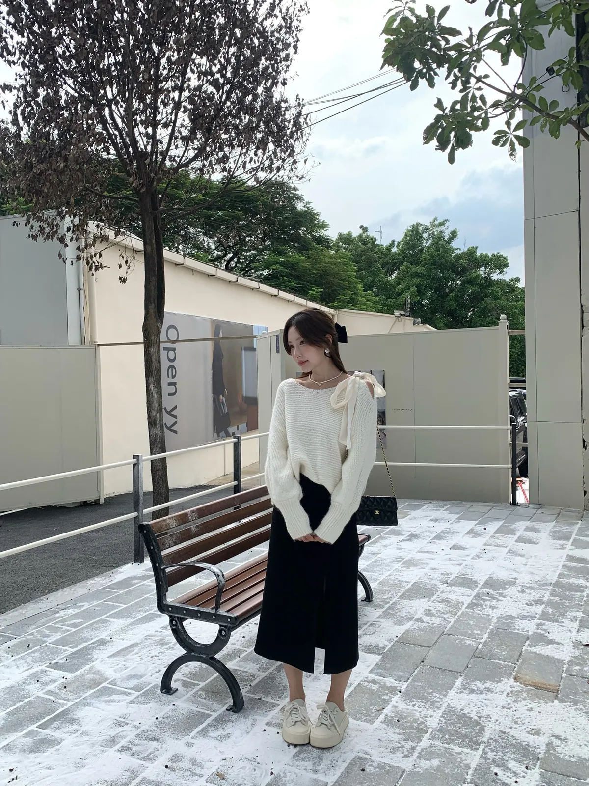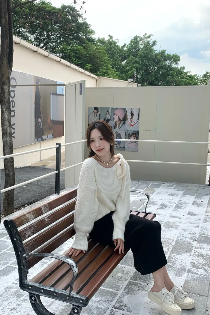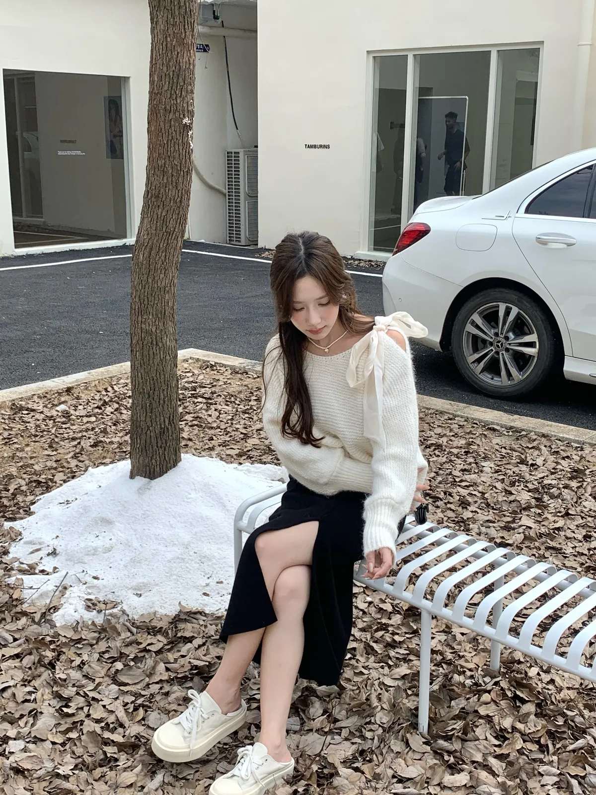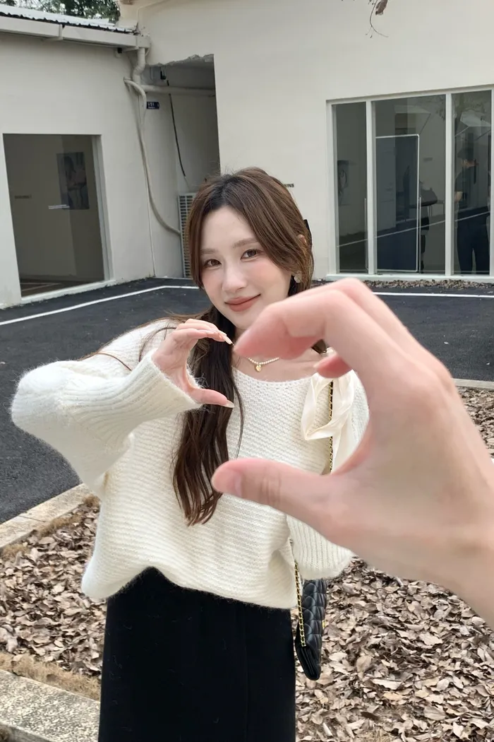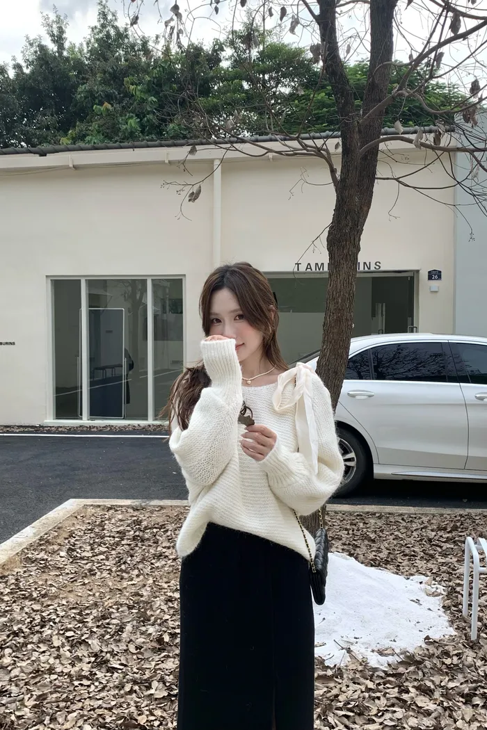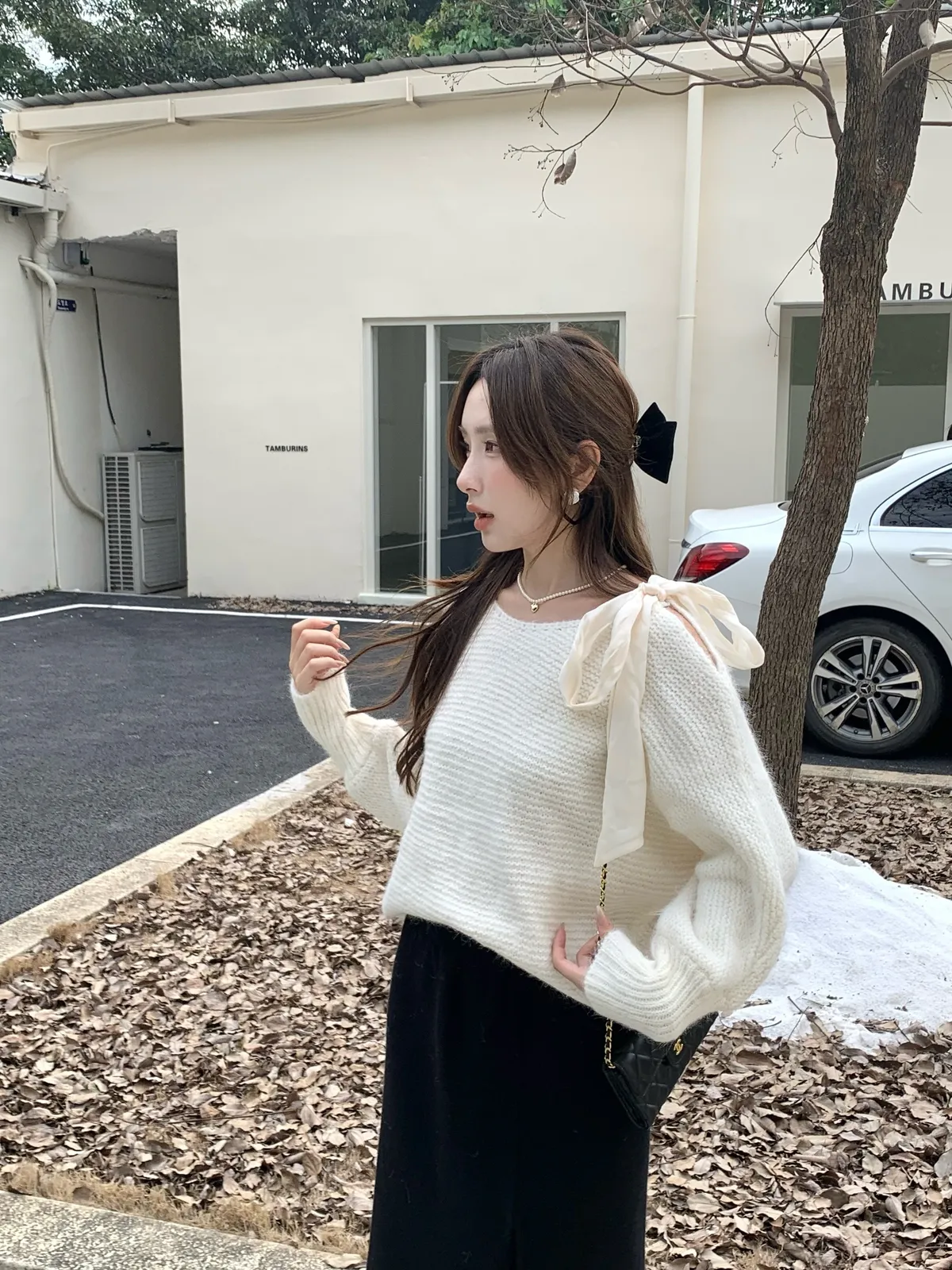 15644 粉嫩色調浪漫 肩綁帶軟糯毛衣